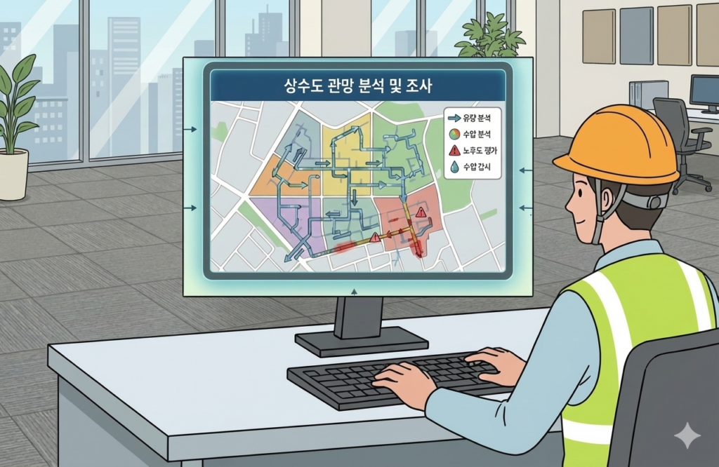 배수관망의 구조와 연결 관계를 확인하고, 유량, 수압, 수질 등 주요 운영 데이터를 수집